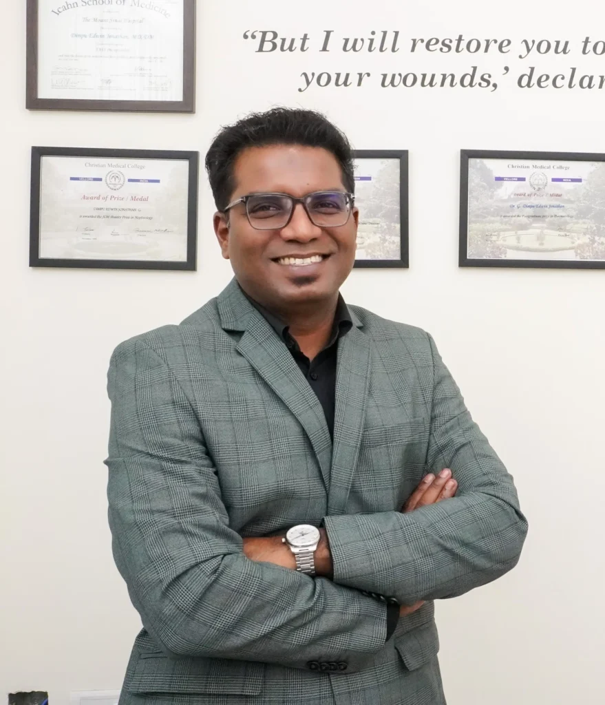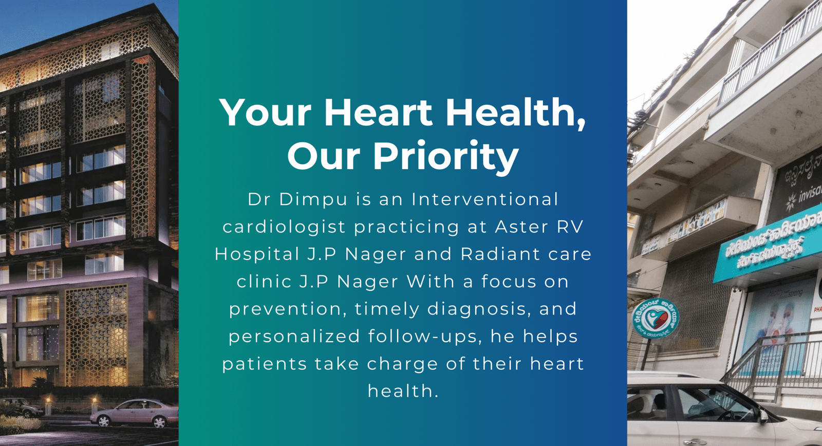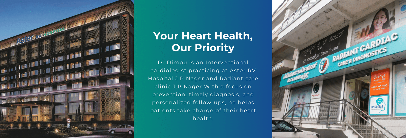 Your Heart’s Health in Expert Hands Dr. G. Dimpu Edwin Jonathan is a Consultant Interventional Cardiologist at Aster RV Hospital, J.P. Nagar, with over 12 years of experience. A Gold Medalist in DM Cardiology, a devout doctor who’s Alma matter is the prestigious CMC Vellore, he went on to further train at Jayadeva Institute of Cardiovascular Sciences and Research. He also completed his advanced TAVR preceptorship at prestigious Mount Sinai Hospital New York under the Guidance of Dr. Samin Sharma, Dr. Annaporna Kini. he is skilled in primary angioplasty, carotid stenting, arterial thrombolysis, arrhythmia management, and hypertension care. Trained at CMC Vellore, he has served in leading hospitals and now offers 24/7 emergency care at Aster RV and personalized consultations at Radiant Care Clinic.